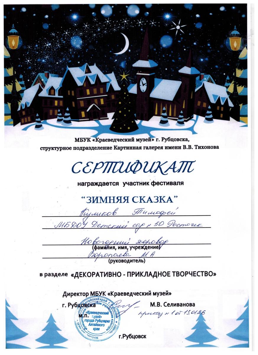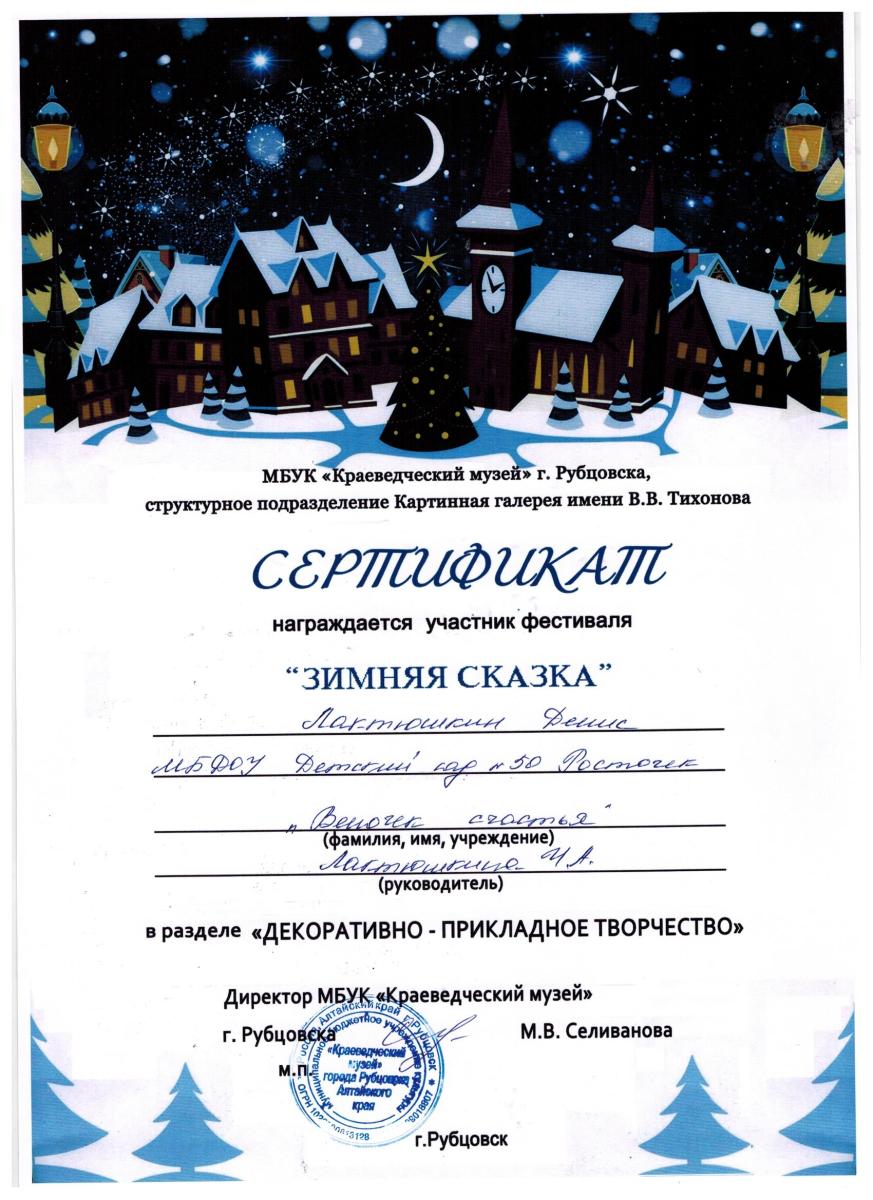 В канун Нового года в городской картинной галерее имени В. В. Тихонова выставка поделок «Зимняя сказка», где можно было увидеть поистине необыкновенные творения. Цель мероприятия - создание необходимых условий для творческой активности всех участников, содействие и укрепление связей детского сада и семьи, создание праздничной, волшебной, новогодней атмосферы. Для детей и родителей-любителей мастерить, фантазировать, творить - эта выставка была особенно интересна! Разнообразные ёлочки, забавные снеговики, заснеженные домики, символы Нового года – всё сделано руками детей и родителей из разнообразных материалов. Сколько у детей было радости в глазах и гордости за поделку, выполненную своими руками вместе с родителями.